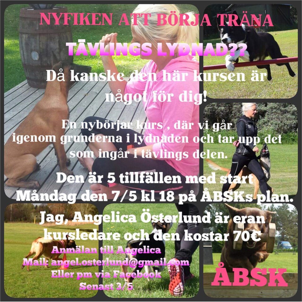 Nybörjarkurs i tävlingslydnad 5 tillfällen, start 7.5 kl.18.00 Kursledare: Angelica Mer info på bilden